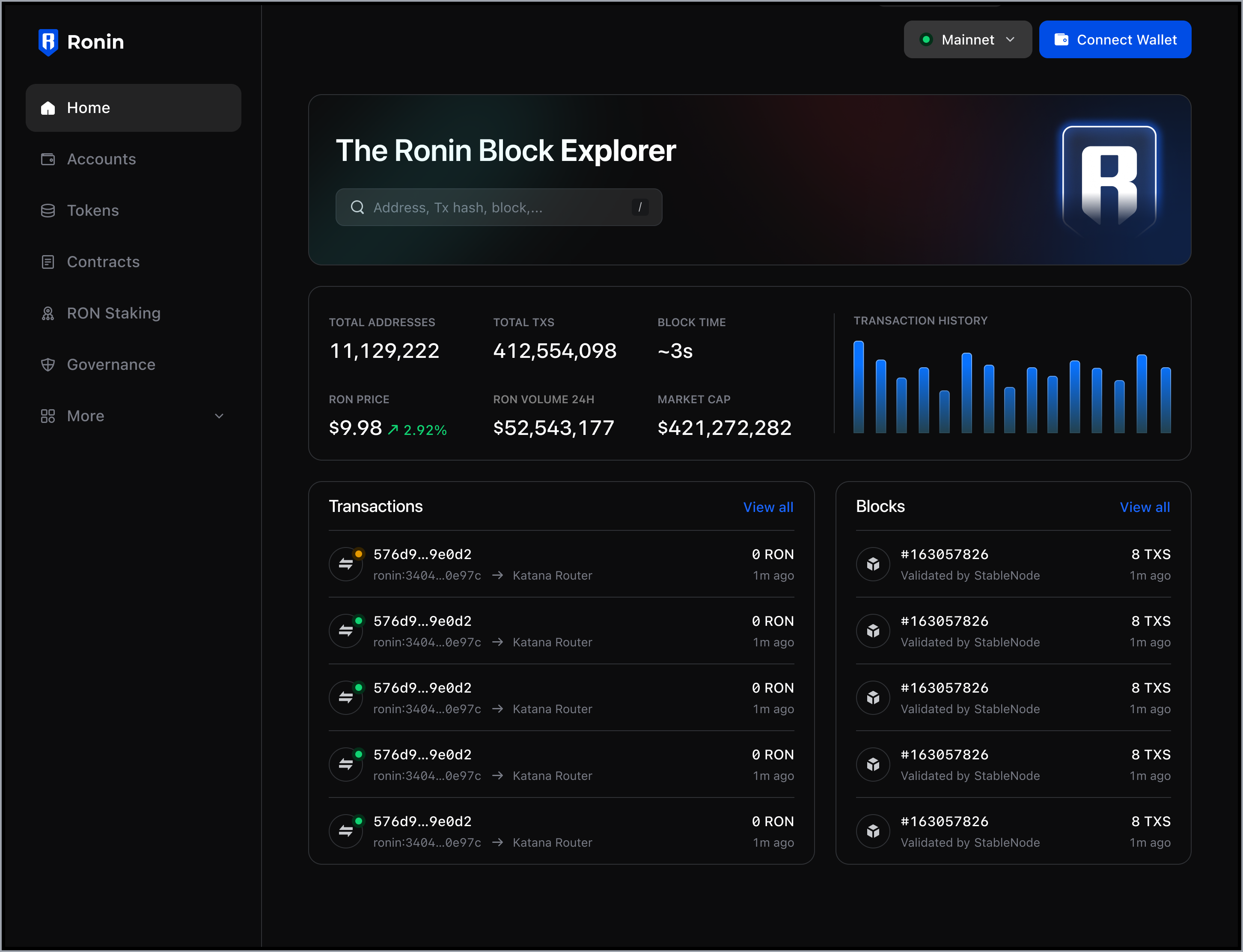 Ronin Block Explorer is an app that allows users to view real-time blockchain data, such as transactions, blocks, addresses, contracts, and tokens. You can use the explorer to review transaction history, track transaction progress, and find addresses and contracts, for example.