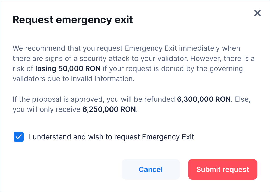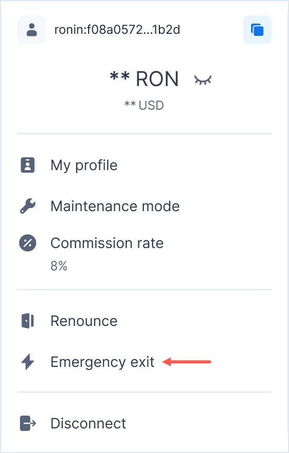 After the emergency exit is complete, you'll no longer be able to confirm blocks on Ronin and receive rewards. Your status will be set to "Renounced."