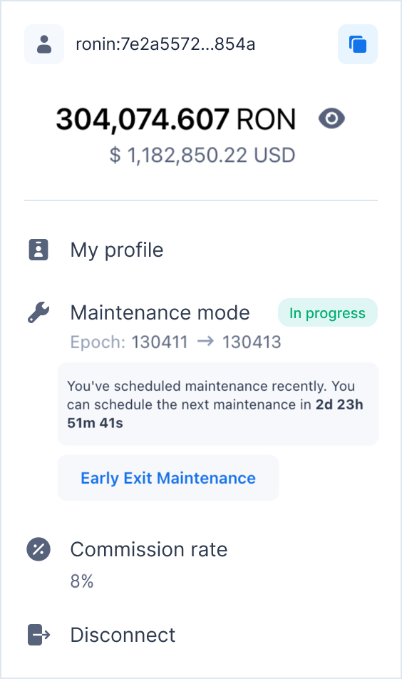 To exit maintenance mode early, open the Validator Dashboard, then go to your account, and then click Early Exit Maintenance. You will resume block confirmation starting from the next epoch.